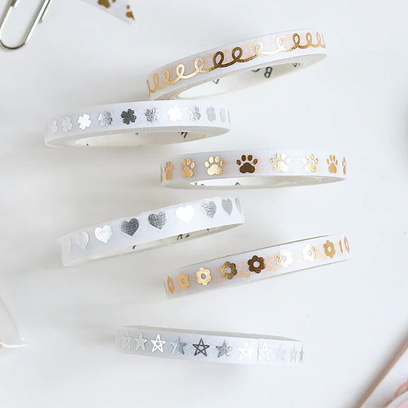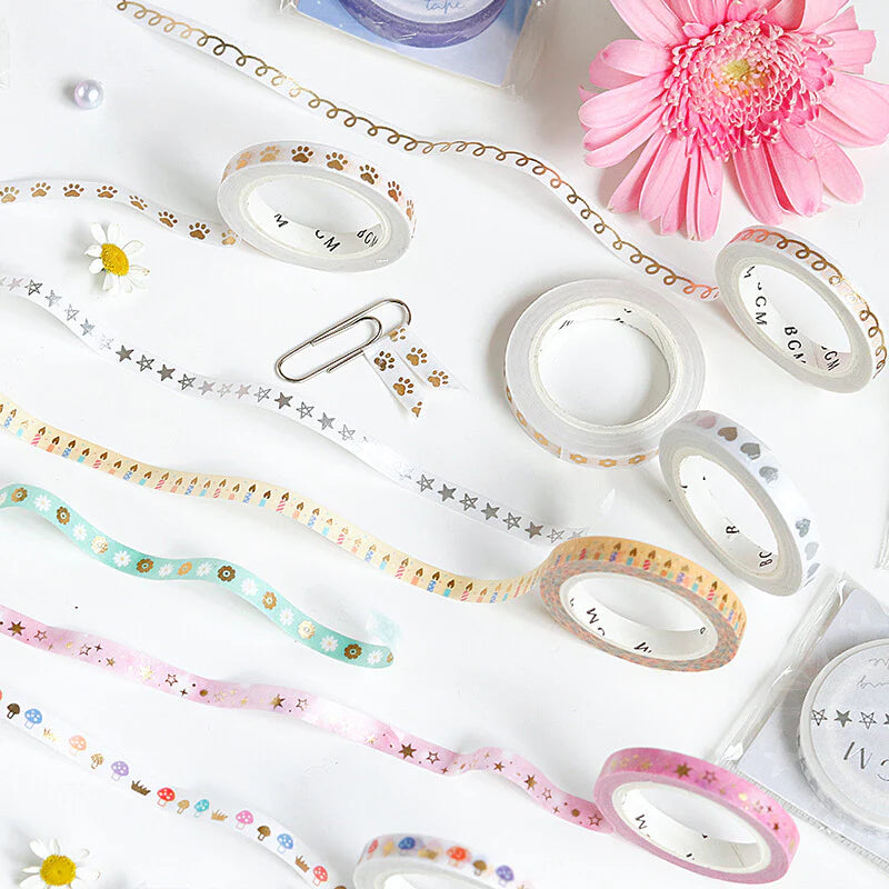 Add glitz and glam to anything that you create with BGM Slim Masking Tape. Each tape has a theme with decorative illustrations. Silver or gold foil adorns it and adds a shine to your creation. Its thin size is ideal for small details while journaling. Take your pick and get creative! BGM is known for its high-quality print and paper.