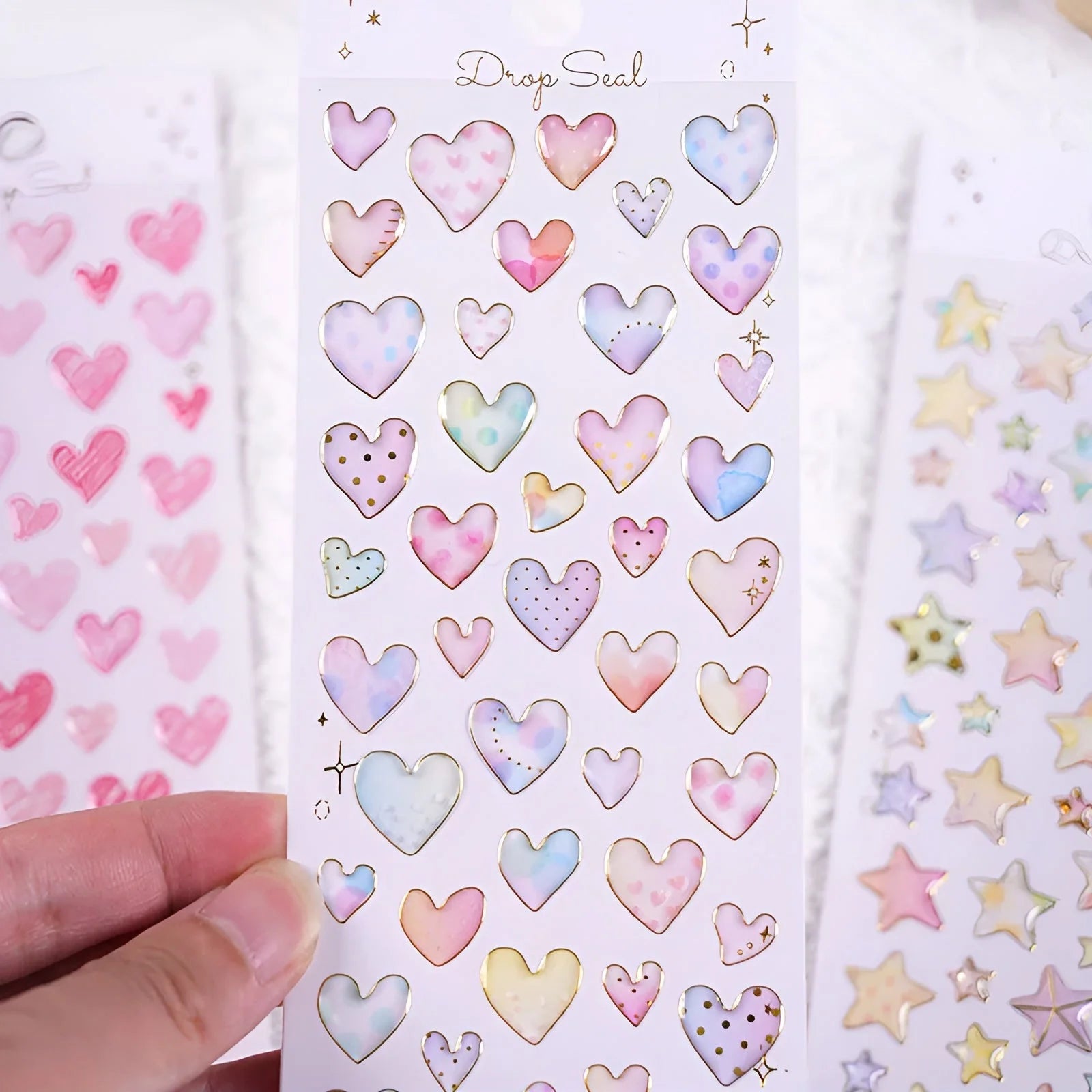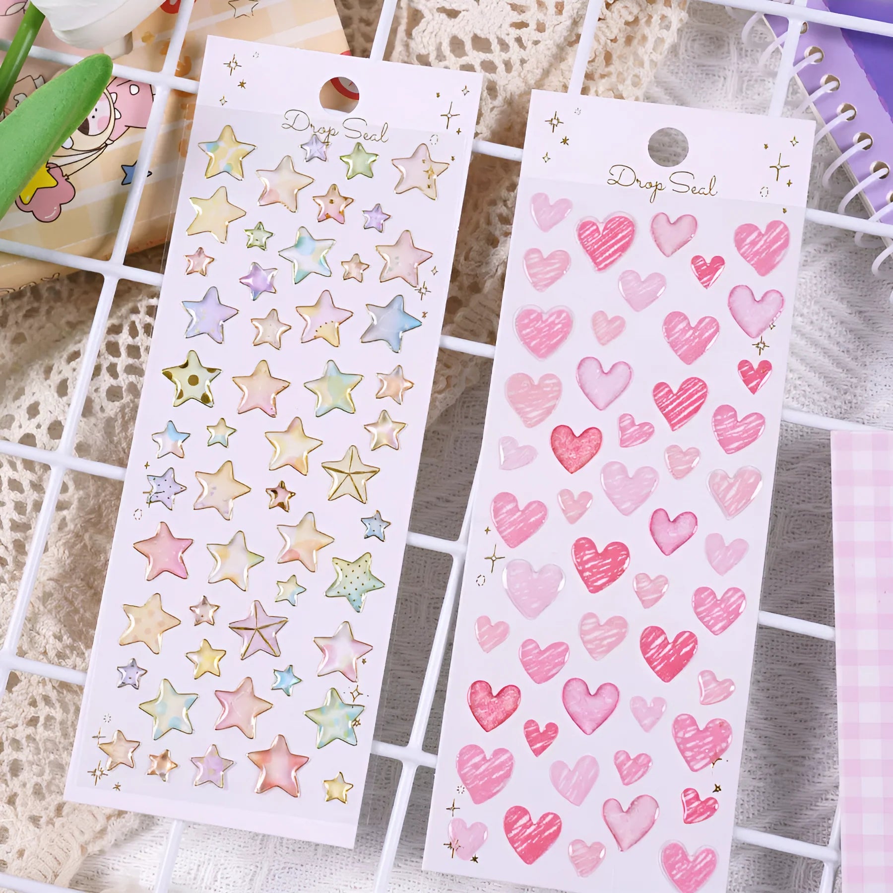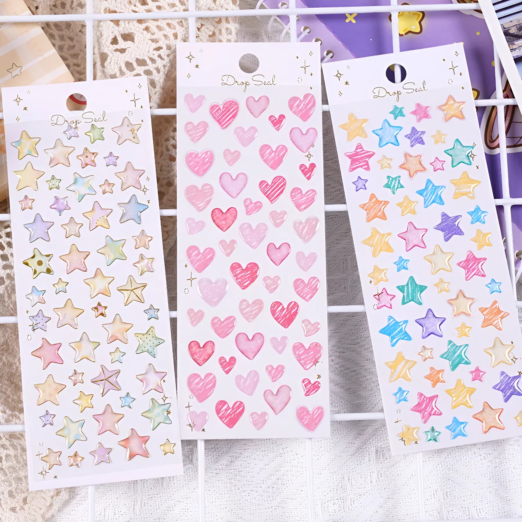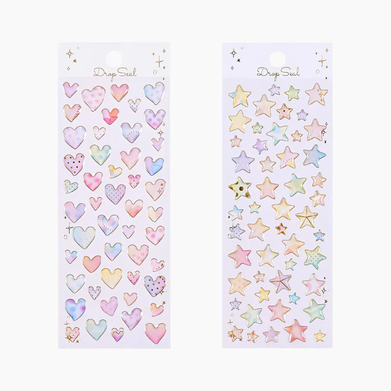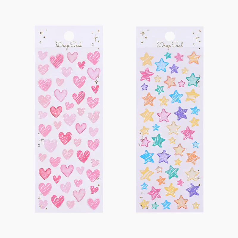 Add a splash of whimsy to your stationery with the Colorful Water Droplet Heart & Star Stickers! These 3D dome stickers feature a glossy, water droplet effect and come in four cheerful designs—two dazzling stars and two adorable hearts. With a fun doodle-style look and various sizes on each sheet, they’re perfect for decorating notes, journals, gifts, and more!