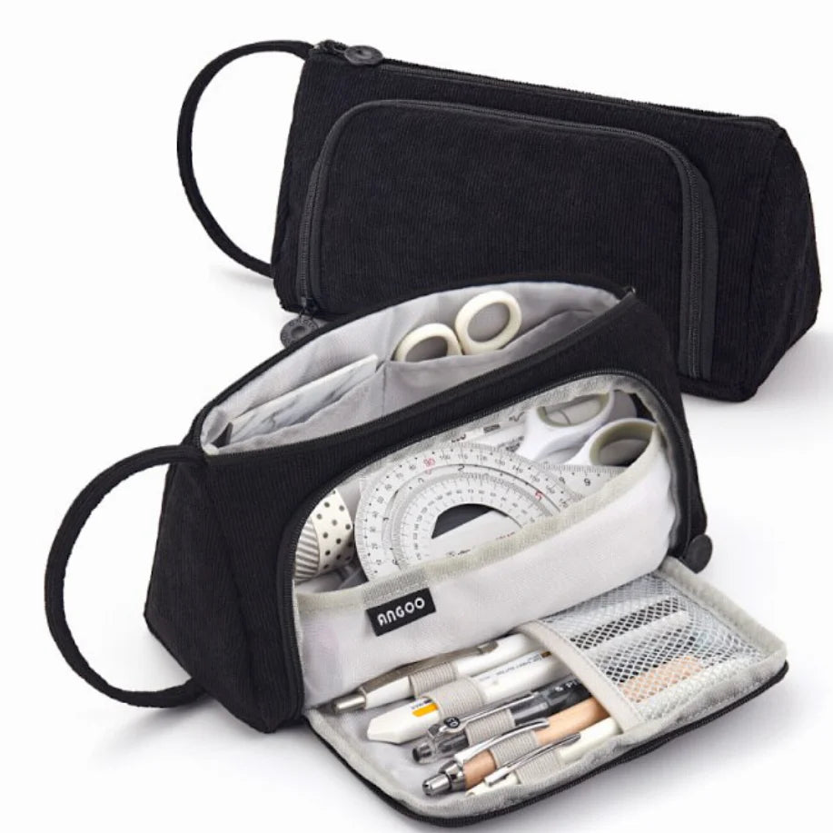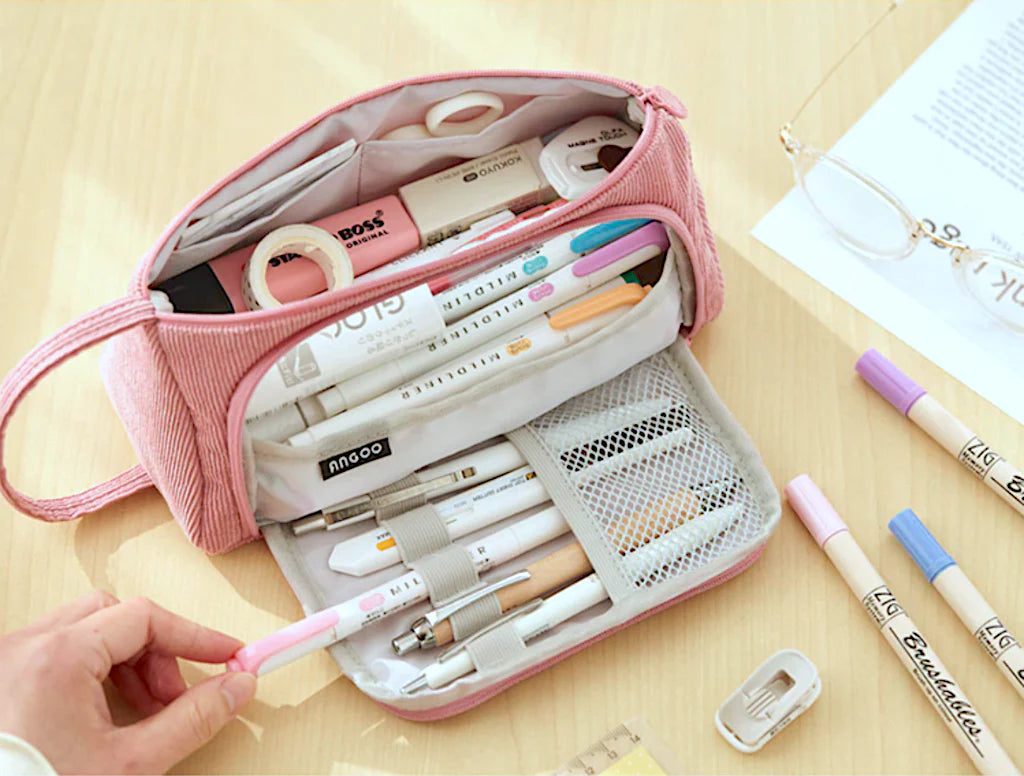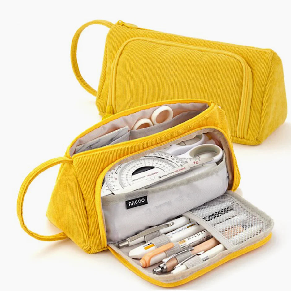 Stay organized in style with the Triangle Corduroy Pencil Case, designed for easy access and efficient storage. Its unique side-opening mesh pocket lets you quickly grab your most-used writing tools, while the main compartment includes two smaller pockets for erasers, sticky notes, or memo pads.