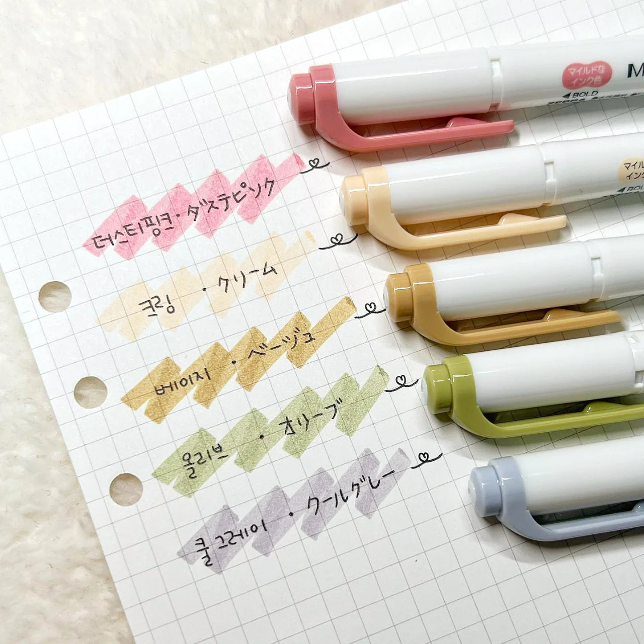 This set includes 5 colors: Mild Dusty Pink, Mild Cream, Mild Beige, Mild Olive, and Mild Cool Gray.